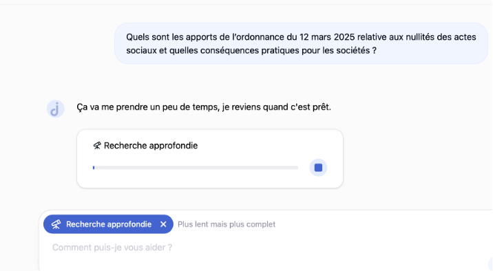 Certains logiciels d’IA juridique de productivité intègrent également une fonctionnalité de recherche, et même, pour certaines d’entre elles, une recherche approfondie Deepresearch