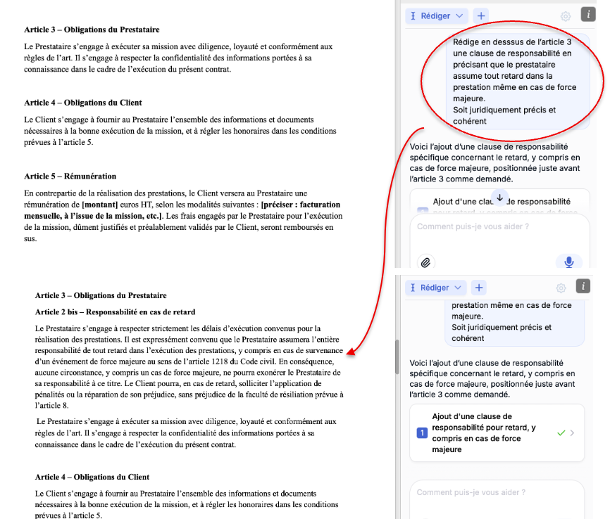 Concrètement, un avocat peut utiliser une IA juridique pour structurer un contrat de prestation de services, reformuler une clause de responsabilité, vérifier la cohérence des définitions ou harmoniser l’ensemble d’un document.